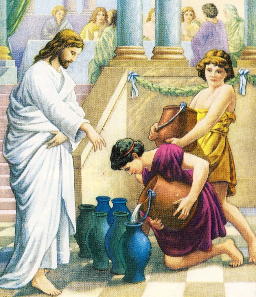 A bijaše ondje Židovima za čišćenje šest kamenih posuda od po dvije do tri mjere. Kaže Isus poslužiteljima: “Napunite posude vodom!” I napune ih do vrha. Tada im reče: “Zagrabite sada i nosite ravnatelju stola.” Oni odnesu. Kad okusi vodu što posta vinom, a nije znao odakle je – znale su sluge koje zagrabiše vodu – ravnatelj stola pozove zaručnika i kaže mu: “Svaki čovjek stavlja na stol najprije dobro vino, a kad se ponapiju, gore. Ti si čuvao dobro vino sve do sada.” Tako, u Kani Galilejskoj, učini Isus prvo znamenje i objavi svoju slavu te povjerovaše u njega njegovi učenici. Nakon toga siđe sa svojom majkom, s braćom i sa svojim učenicima u Kafarnaum. Ondje ostadoše nekoliko dana. (Iv 2,1-12).